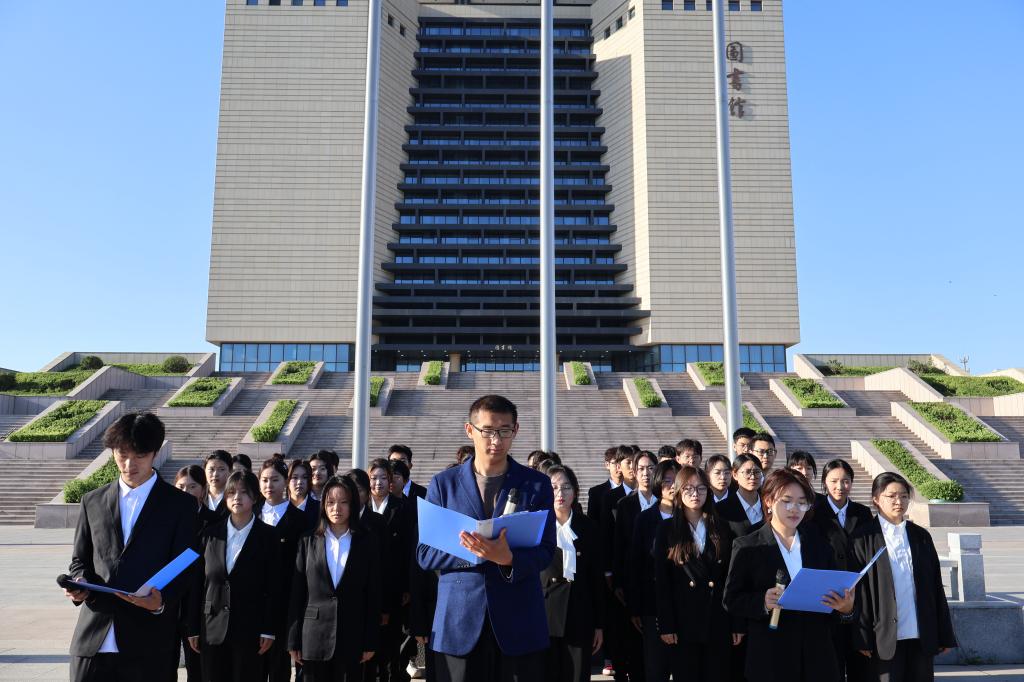教师代表殷浩松、2024级学生代表杨昕萌、刘琦带着跟读同学进行国旗下“信立中国,法筑基石”主题朗诵。他们用慷慨激昂的语言感染了在场所有同学们,激励青年传承五四精神,厚植诚信品格:以学术坚守践行科学报国,以网络守信筑牢道德根基,以职业底线诠释责任担当,将诚信融入民族复兴征程,用青春力量建设诚信中国,让五四火炬绽放时代光芒。