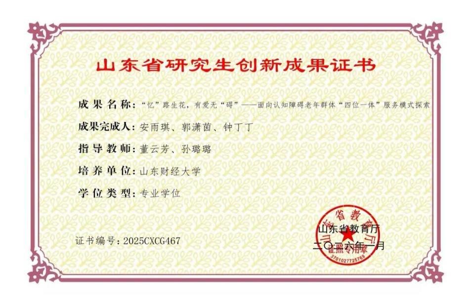 研究生团队申报的成果《“忆”路生花,有爱无“碍”——面向认知障碍老年群体“四位一体”服务模式探索》成功入选,该团队由2024级社会工作研究生安雨琪作为负责人,2024级社会工作研究生郭潇茵、钟丁丁为成员,董云芳、孙璐璐担任指导教师,展现了色色视频