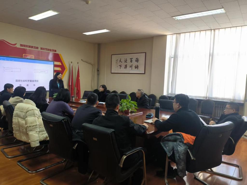 教师进行2024年国家社科基金申报书初稿的论证与指导。院长赵信会、教师代表赵建良、王华、吕欣、肖夏、董文、赵景顺、刘岩、杨姿等参加会议。副院长纪建文主持会议。