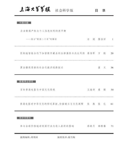 董文副教授在《上海大学学报(社会科学版)》2023年第2期发表论文《算法错误侵害的社会化救济进路探讨》。《上海大学学报(社会科学版)》是教育部名栏工程入选期刊、中文社会科学引文索引(CSSCI)来源期刊、全国中文核心期刊、中国人文社会科学核心期刊、全国高效社科名刊,由上海市教育委员会主管、上海大学主办。