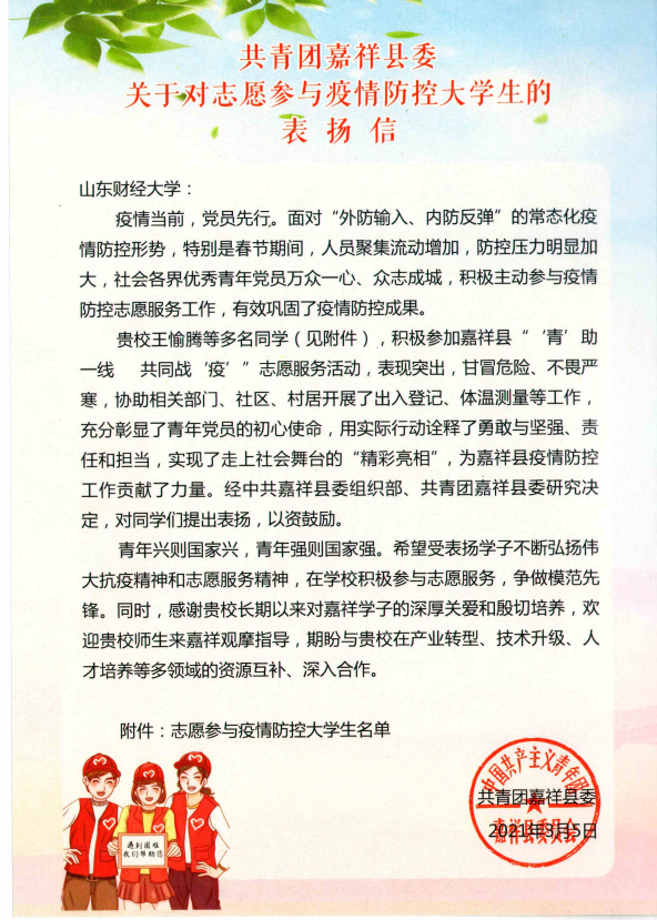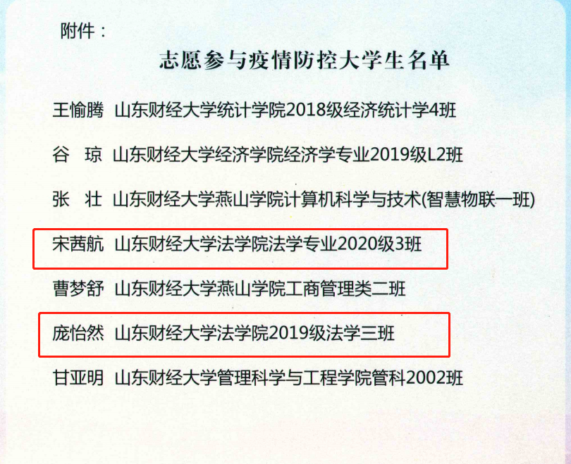 收到来自共青团嘉祥县委的一封感谢信,对疫情期间奋斗在一线的抗疫青年志愿者:2020级法学3班宋茜航同学、2019级法学3班庞怡然同学进行了表扬。信中对他们在抗击疫情的紧要关头,积极响应号召,主动投身疫情防疫一线,充分发扬志愿服务精神及认真负责的工作态度给予了高度肯定,同时对学院的人才培养工作表示感谢。